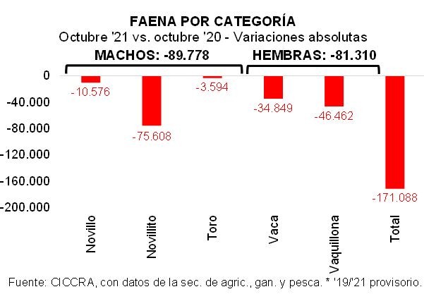 En octubre se faenaron 593,1 mil machos, es decir 13,1% menos que en octubre de 2020. En términos absolutos la faena de machos se contrajo en 89.778 cabezas, la caída alcanzó a todas las categorías y 84,2% estuvo explicada por la menor faena de novillitos.