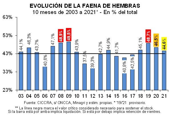La participación de las hembras en la faena total retrocedió a 44,6% (-1,9 puntos porcentuales en relación a enero-octubre de 2020), ubicándose incluso por debajo del ratio registrado en enero-octubre de 2018 (45,1%).
