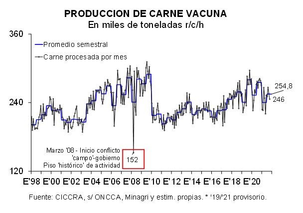 En enero-octubre de 2021 se produjeron 2,461 millones de toneladas r/c/h de carne vacuna. Es decir, 6,2% menos que en enero-octubre de 2020 (-8,2% anual corregido por el número de días laborables). El peso promedio en gancho del animal faenado se ubicó en 230 kilos (+1,4% anual).