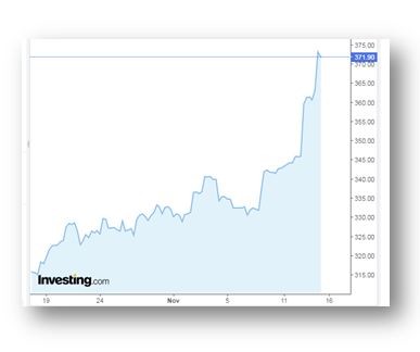 Precio por Ton. Futuros de harina de soja en Chicago, desde que se inició noviembre