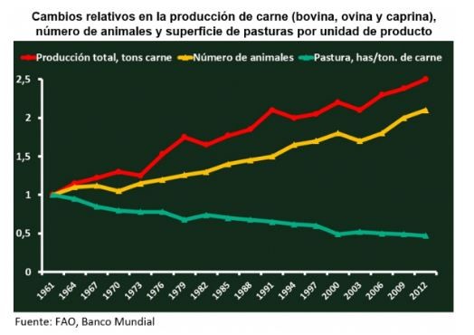 Para apreciar este cambio, Elizalde presentó un gráfico con la producción de carnes de diferentes especies desde los años ‘60 que muestra su crecimiento constante, pero en una menor superficie de pasturas, lo que va en línea con la escasez de áreas para la cría mencionada. “La producción mundial subió a razón del 1,5% por año en promedio, en las ganaderías más desarrolladas al 3% y en otras al 0,8% por año, mientras la Argentina apenas crece al 0,2- 0,1% y a veces nada”, aseveró.