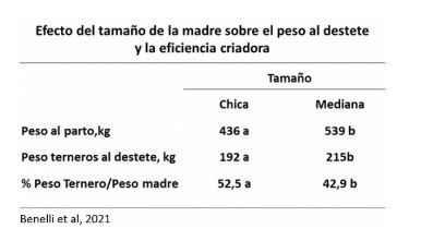 Un tema muy estudiado es el tamaño de la vaca adulta que tiene una enorme influencia en la cantidad de kilos de ternero por vaca que se terminarán destetando. Para visualizar su impacto, presentó un estudio de la Universidad de Nebraska, publicado en 2021, en el cual durante 20 años se hizo un seguimiento de vacas chicas de 436 kg promedio al parto contra medianas de 539 kg.