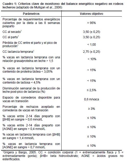 En el Cuadro 1 se presentan una serie de criterios prácticos para monitorear el balance energético y prevenir el desarrollo de cetosis.