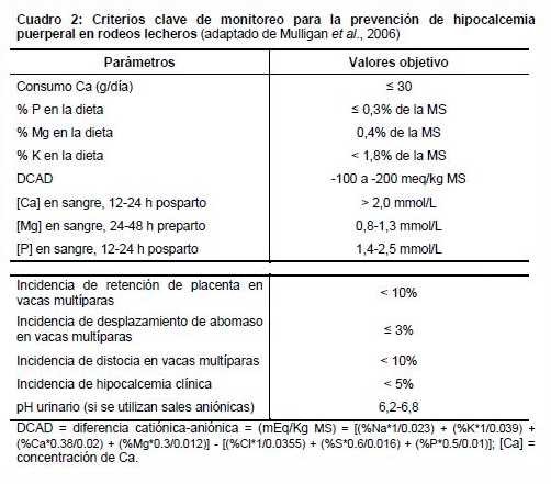 Cuadro 2: Criterios clave de monitoreo para la prevención de hipocalcemia puerperal en rodeos lecheros (adaptado de Mulligan et al., 2006)