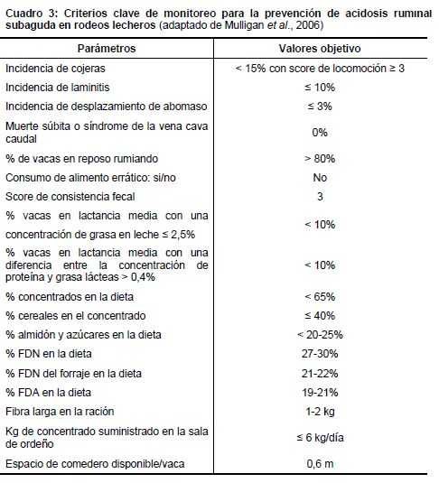 Cuadro 3: Criterios clave de monitoreo para la prevención de acidosis ruminal