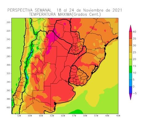 La perspectiva comenzará con tiempo fresco, debido a la irrupción de aire polar ocurrida en los días precedentes, pero, los vientos del trópico retornarán con vigor, extendiendo su dominio sobre la mayor parte del área agrícola, con temperaturas máximas superiores a lo normal, y sólo las zonas cercanas al Litoral Atlántico observarán registros menos intensos. Paralelamente, se producirá el paso de un frente de tormenta, produciendo precipitaciones de variada intensidad en el centro y el nordeste del área agrícola, mientras el resto de su extensión registrará valores escasos. Junto con el frente, se producirá una vigorosa entrada tardía de vientos del sur, que extenderá su dominio sobre la mayor parte del área agrícola, produciendo temperaturas mínimas bajo lo normal, con riesgo de heladas tardías en el oeste y el extremo sur del área agrícola.