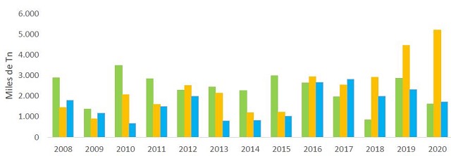 Gráfico 2. Cargas de productos seleccionados 2008-2020-Puerto Bahía Blanca