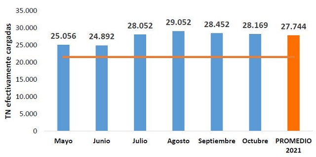 Dado que el maíz es el principal cereal exportado por el puerto de Bahía Blanca y el cultivo sobre el cual se evidencian los mayores efectos de la bajante del río Paraná, se analizó la carga efectiva promedio por buque en el período del 3/05 al 31/10 del 2021, en comparación con un completamiento promedio histórico de 21.500 Tn2.