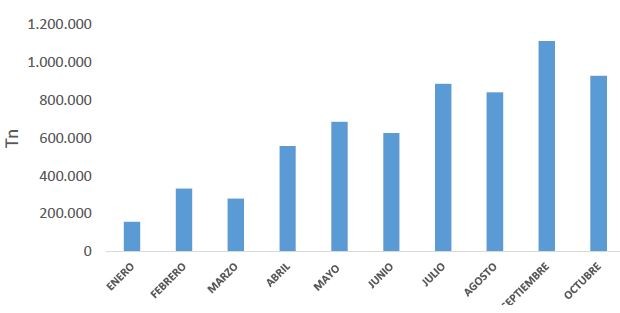 Como se desprende del Gráfico 3, mes a mes los embarques de maíz por el puerto local fueron creciendo, hasta alcanzar un máximo en septiembre de 1,1 M Tn. En el mes de octubre se evidencia la merma en el total de envíos, aunque el completamiento promedio se situó por encima de las 28.000 Tn (ver Gráfico 1), aun con valores por encima del promedio histórico.