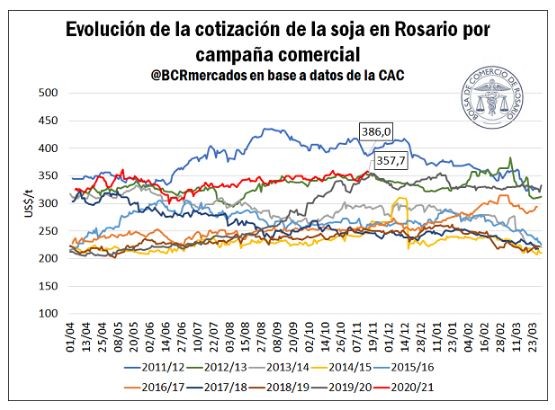 Los precios cámara valorizados a dólar CCL recuperaron terreno en la semana, subiendo más del 3% y aproximándose así a los US$ 358/t para la soja. De esta manera, las cotizaciones para esta época del año se encuentran en máximos que no se veían en diez años. Asimismo, los precios del maíz se mantuvieron estables en torno a los US$ 200/t en la semana.
