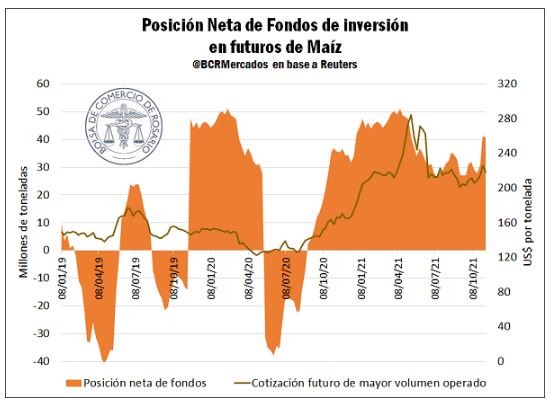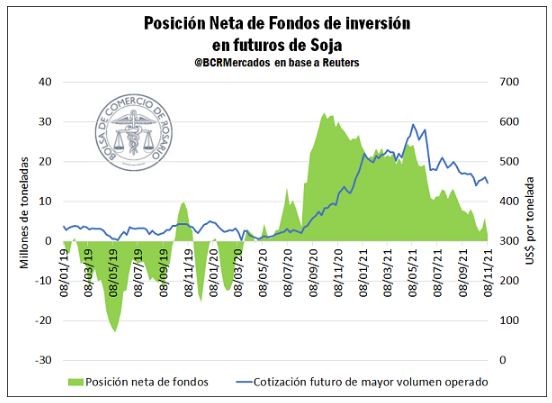 Por otra parte, el posicionamiento de los fondos de inversión en futuros de soja se mantiene netamente comprador desde febrero del 2020. No obstante, este posicionamiento viene cayendo pronunciadamente hace meses, lo que ha colaborado en las fuertes bajas que hasta hace poco venía experimentando el poroto. Sin embargo, el recorte de posiciones parece haberse aminorado y en vista de lo sucedido en los últimos días podría recuperar volumen en las próximas jornadas.