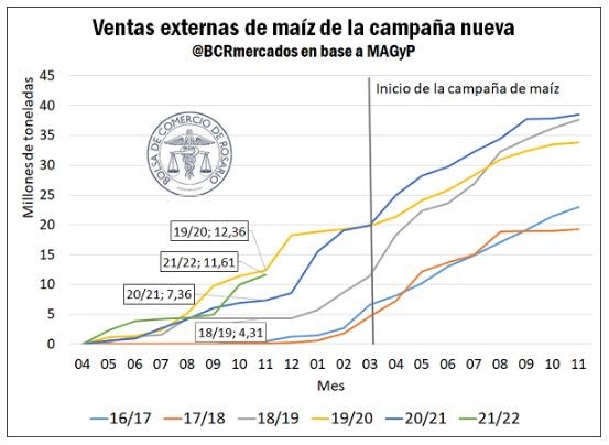 Mirando la campaña 21/22, el maíz también sigue sumando ventas externas