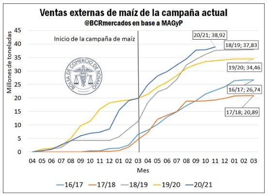 A casi cuatro meses de terminar la campaña, las ventas externas de maíz 2020/21 acumulan 38,92 Mt. Consecuentemente, este valor ya supera al registrado en todo el año comercial 2018/19, convirtiendo a la campaña actual en la de mayor declaración de la que se tenga registro.