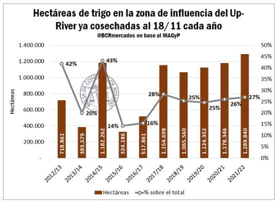 El avance de las labores de cosecha en la zona de influencia de los puertos del Up-River alcanza ya al 27% del área total a recolectar, según información del Ministerio de Agricultura, Ganadería y Pesca (MAGyP), algo por encima de lo registrado a igual momento del año previo y del promedio de los últimos cinco años. Pero, además, como el área destinada al cereal creció 6% respecto de la campaña 2020/21 y alcanzó un máximo en 20 años, el total de hectáreas cosechadas a la fecha asciende a 1.289.840, un récord para el momento del año.