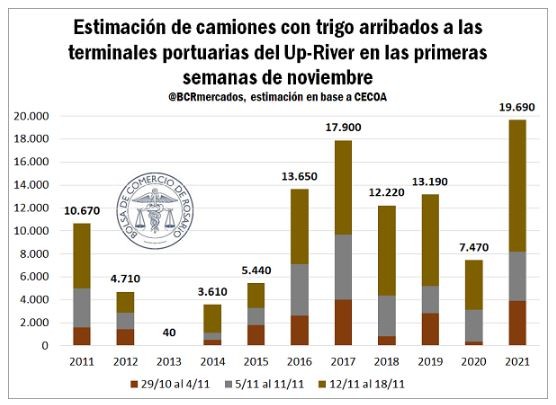 De esta manera, el buen avance en la cosecha y la mayor producción se ven reflejadas en el ingreso de camiones con trigo a las terminales portuarias de la región. En las últimas tres semanas (es decir, desde fines de octubre a la fecha) han ingresado aproximadamente 19.690 unidades a los puertos del Up-River, más que duplicando el número de camiones ingresado en igual período del año previo (7.468) y un récord para igual período de años anteriores (la mejor marca anterior la ostentaba la campaña 2017/18, con 17.904 camiones). Además, de ese total, aproximadamente 11.520 lo hicieron en los últimos siete días, lo cual da cuenta de una aceleración en el arribo de trigo a las terminales de la región.