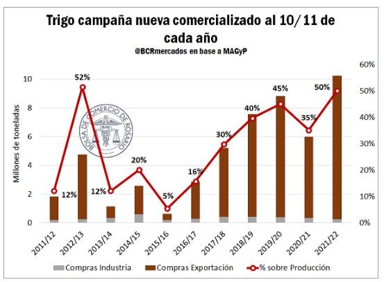Podría suponerse que una de las razones que explica este elevado volumen de grano que ya se encuentra vendido cuando aún faltan unos días para el inicio oficial de la cosecha es la mencionada mayor producción esperada para el corriente año (de hecho, se espera que, por primera vez en la historia, Argentina produzca más de 20 Mt). Sin embargo, tomando el grano ya comercializado como proporción del total producido en la campaña, también se tienen que trigo ya vendido alcanza al 50% del total, superando ampliamente el 35% de la campaña anterior a estas alturas del año y al promedio de los últimos cinco ciclos (33%). De hecho, es la segunda mayor proporción de la historia, sólo superada por lo ocurrido en la campaña 2012/13 (52%).