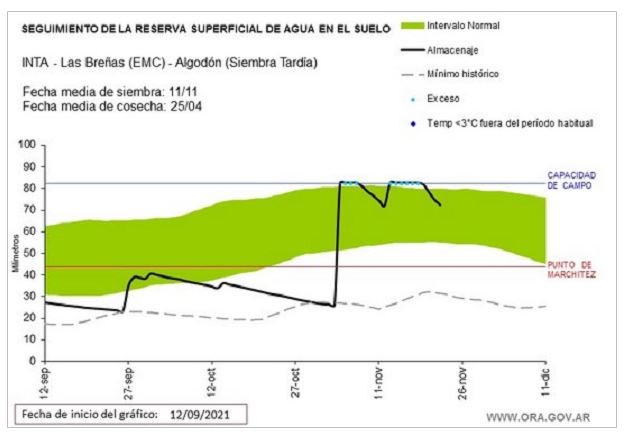 Tanto la campaña pasada como la presente, han tenido que lidiar con las condiciones de adversidad que impone la escasez de humedad. Observemos por ejemplo, la marcha de reservas superficiales en Las Breñas, desde comienzos de septiembre hasta casi finales de noviembre. La línea negra permite distinguir con mucha contundencia la ausencia de agua para cualquier tipo de laboreo incluso avanzando sobre las primeras fechas de siembra del mes de octubre.
