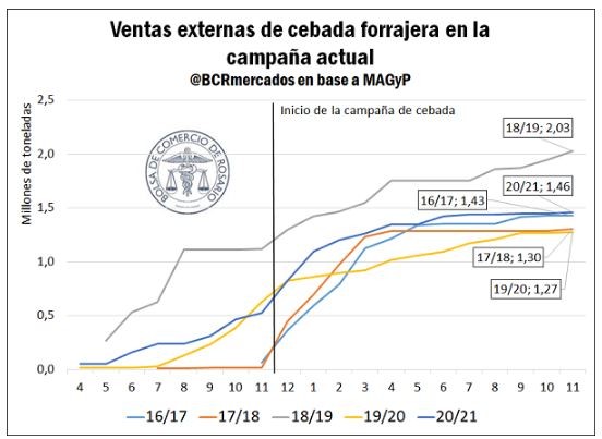 En el cierre de la campaña 20/21, las ventas externas de cebada forrajera superaron levemente a las del año comercial 2016/17. Así, se consolida el segundo mayor nivel de ventas externas en al menos cinco años. Por su parte, los compromisos de exportación de cebada cervecera se ubican en mínimos de cinco años, con 0,92 Mt anotadas en DJVE para el año comercial 2020/21, muy por debajo de las 1,32 Mt de la campaña 19/20.