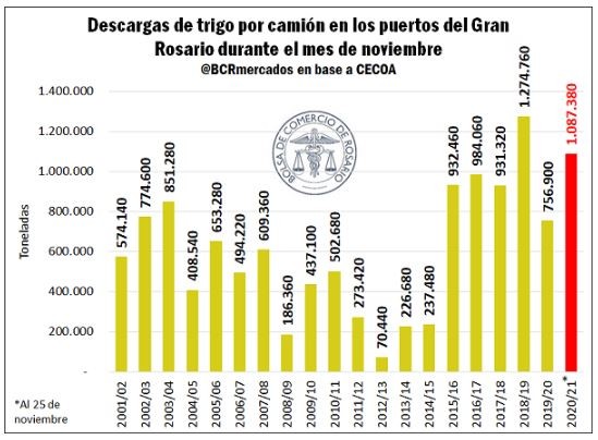 A medida que avanza el mes de noviembre continua sostenidamente el ingreso de camiones para descarga de trigo en los puertos de todo el país. En lo que va del mes, ya arribaron más de un millón de toneladas de trigo, el segundo valor más alto de la historia para este mes del año.
