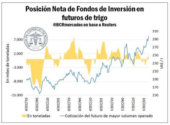 En el mercado de Chicago, el posicionamiento neto comprador del trigo volvió a crecer y escaló casi 1,5 Mt esta semana, acercándose así a las 2 Mt. De esta manera, consolida su tercera semana consecutiva en posición neta compradora, seguidilla que no se veía desde agosto. Así, las tomas de posiciones de los fondos siguen colaborando en apuntalar las cotizaciones del cereal.