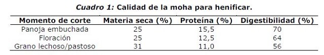 Verdeo de moha La moha es un cultivo de fácil implantación, precoz y de alta producción de forraje. En Chascomús se han obtenido rendimientos de 6000 a 7000 kg MS/ha y en Balcarce de 10000-11000 kg MS/ha sin fertilización, y de más de 16000 kg MS/ha con fertilización. Es una gramínea tolerante a elevadas temperaturas y ambientes secos debido a su ciclo corto y a sus bajos requerimientos de agua. Sin embargo, los déficits hídricos prolongados afectan la productividad del cultivo debido a que su sistema radicular es poco profundo. Esta especie viene siendo mejorada por INTA desde hace muchos años. A partir de los cultivares tradicionales Carapé y Yaguané INTA, generados por la EEA Pergamino, se llegó a las actuales Carapé Plus y Yaguané Plus INTA. Al tener un ciclo muy corto, permite combinar altos rendimientos con un bajo tiempo de ocupación del lote, permitiendo inclusive realizar dos cultivos en la misma estación. La siembra de moha constituye un buen antecesor para las pasturas perennes debido a que permite controlar malezas estivales y, por su corto ciclo, hacer un buen barbecho previo a la implantación de las mismas. Presenta una capacidad de rebrote limitada que restringe el aprovechamiento bajo pastoreo directo, por lo cual su utilización principal es la henificación. La calidad del heno varía en función del momento de corte. En el estado de panoja embuchada la moha tiene más calidad, mientras que si corta en grano pastoso el rendimiento total se incrementa, pero su calidad es menor (Cuadro 1).