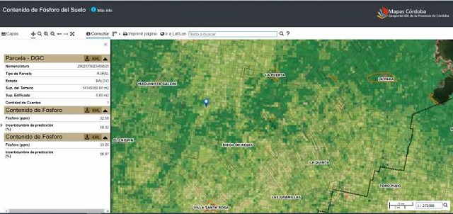 El nuevo mapa incluye las capas de clases de suelo (Cartas de Suelo), límites administrativos (departamentos y radios municipales) y catastro rural (Figura 5). El usuario puede así mismo, consultar en cualquier localización el contenido de P y el nivel de incertidumbre de la predicción, como así también buscar localidades, parajes o campos mediante nomenclatura catastral o el Nro. de Cuenta de Rentas. Los nuevos datos pueden adicionalmente, accederse como web service desde otras aplicaciones o soluciones de software (desde la sección Geoservicios) o descargarse en diversos formatos abiertos (en Descargas).