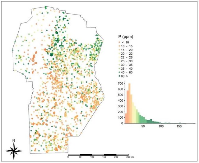La zona noroeste, en cambio, presenta suelos de alto contenido nativo de P y los sistemas de producción son más recientes, por lo que la proporción de suelos que presenta niveles de P adecuados para la producción de cultivos, es mayor. En esta región, la reducida aplicación de P y la continua remoción en cosechas, resulta en balances negativos y, consecuentemente, genera disminuciones del P del suelo respecto de los elevados niveles originales.