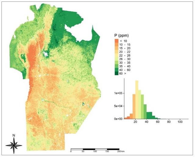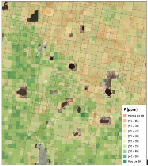 Los bajos niveles de la región centro-sur se asocian principalmente a la historia agrícola de la región. En este sector, durante muchos años, no se aplicaron fertilizantes o abonos fosfatados o se aplicaron por debajo de las cantidades removidas en los cultivos, resultando balances negativos de P para dichos suelos. En estas áreas, mayormente de producción agrícola-ganadera, la capacidad productiva de los suelos se ve limitada por la baja disponibilidad de P, siendo necesaria la aplicación de fertilizantes, abonos o enmiendas con P. La Figura 4 presenta un sector centrado en la localidad de Alejo Ledesma donde se observan valores variables del contenido de fósforo, entre 15 y 45 ppm.
