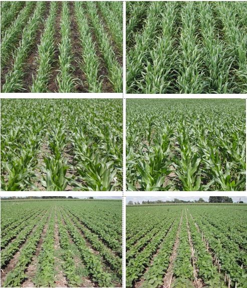Figura 2. Trigo, maíz y soja sin P (fotos a la izquierda) y con P (fotos a la derecha). Ubicación: Alejo Ledesma, Córdoba. Red de Nutrición Región CREA Sur de Santa Fe.