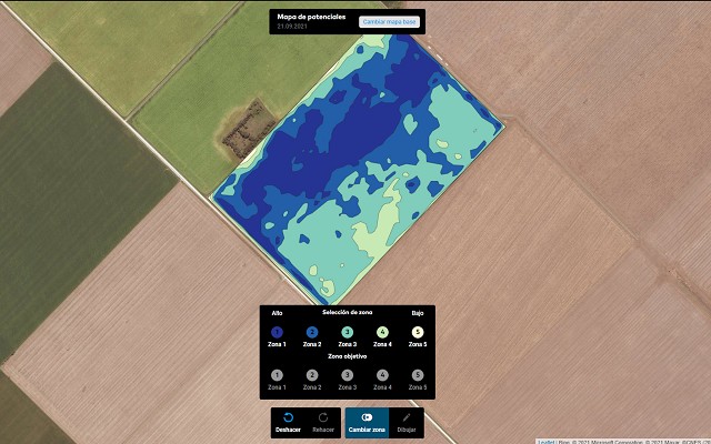 A partir de inteligencia artificial, interpreta esas fotografías y construye un mapa que; en una gama de cinco colores de verde de más claro a más oscuro, muestra cuáles son las zonas con más y menos potencial del campo.