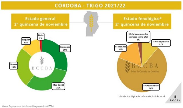 En cuanto a los estadios fenológicos, hacia fines del mes de noviembre, más del 80 % de los lotes se encontraba en estado de grano pastoso, mientras que el restante 19 % ya transitaba su etapa de madurez.