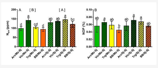 El aporte de N al sistema está relacionado con la producción de biomasa. Estudios realizados en la región pampeana en vicia como cultivo de cobertura mostraron que para producciones entre 4000 y 8000 kg ha-1 de biomasa, la vicia aportará entre 108 y 196 kg N ha-1, de los cuales en promedio el 60% proviene de la fijación simbiótica. Un cultivo de vicia en promedio toma 24 kg de N por cada 1000 kg de biomasa producida de los cuales aproximadamente 16 kg provinieron de la FBN. En los mismos estudios analizando arveja, para producciones de biomasa entre 2000 y 4000 kg ha-1, el cultivo tomó entre 52 y 107 kg N ha-1, de los cuales un 65% provino de la FBN (Figura 1).