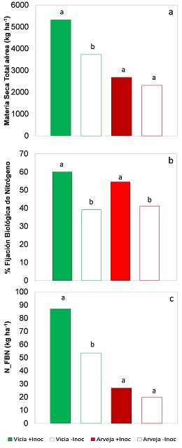Figura 1: Biomasa aérea total (TDM) (a), proporción de N derivado de la fijación biológica (% Ndfa) (b) y absorción de N a través de NBF (N_BFN) (c) en vicia (n=16) y arveja (n=16) con (+ Inoc) y sin (- Inoc) inoculación de semillas. Dentro de cada especie, letras diferentes indican diferencias significativas (p≤ 0.05) entre tratamientos. Cada columna es un promedio de dos años.
