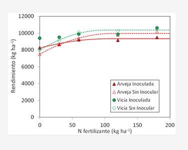 Figura 2: Relación entre la dosis de fertilizante nitrogenado aplicado y el rendimiento en maíz sembrado sobre dos antecesores (arveja y vicia) con y sin la aplicación de inoculantes en estos antecesores. Las líneas indican el ajuste cuadrático-plateau a los tratamientos en donde hubo efecto significativo de la fertilización nitrogenada.