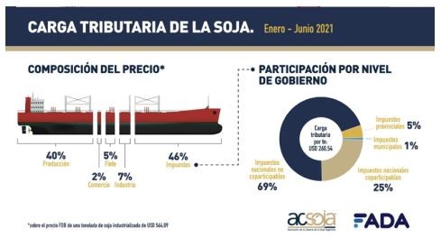 Sin embargo, no sólo al productor se le extrae. Como refleja la siguiente infografía de Fundación Fada. De cada barco de soja, el 46% es para el estado en su conjunto vía impuestos. Sin embargo, casi el 70% se lo apropia el estadio nacional, en impuestos NO COPARTICIPABLES, como los derechos de exportación y el impuesto a los débitos y créditos bancarios, que no vuelven a las provincias y municipios desde donde se producen dichos granos.