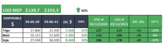 Si comparamos en forma interanual las cotizaciones locales, y las convertimos a dólar MEP, todos los granos crecieron algo más del 30%, cuando la divisa lo hizo en un 45%