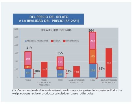 En tierra argenta, un productor del precio internacional, recibe sólo un 38% del valor del trigo, un 41% en maíz y un 32% en soja. Consecuencia de los derechos de exportación, y distorsiones provocadas por el diferencial cambiario más precios que fija la industria. Así lo refleja, este gráfico períódico, que Carlos Etchepare comparte en su cuenta de twiter: