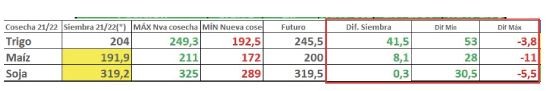 Te invito a analizar en la siguiente tabla, qué pasó con los precios disponibles, desde siembra, mínimos y máximos: