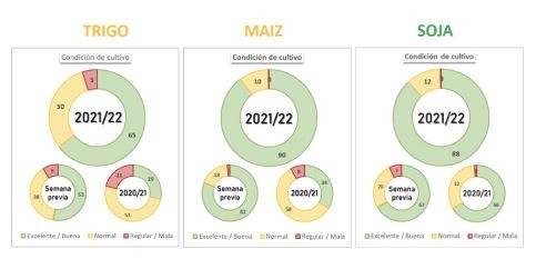 Los números para la próxima campaña confirman lo que nuestra mirada “percibe”. Los indicadores muestran cómo el verde de condiciones excelente a buena en los principales cultivos, mejoran notablemente respecto a la campaña anterior, como pueden apreciar gráfica y sintéticamente en este resumen en base a información de la Bolsa de Cereales de Buenos Aires.