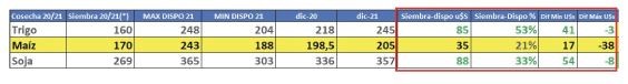 Es importante valorar que tanto en trigo como en soja, actualmente los precios disponibles en mercado local, se encuentran cercano a sus máximos. En ambos cultivos, vale rescatar el mayor valor desde que decidiste su siembra, quienes capitalizaron U$s 85 y U$s 88 respectivamente.