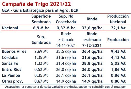 Los ajustes son por la cosecha: con un 57 % de avance, los promedios están sorprendiendo. La campaña también alcanzó un nuevo nivel de siembra: es la mayor de los últimos 19 años, con 100.000 ha más y 6,9 M de ha implantadas. Los promedios de rindes están entre las marcas más altas, muchos son récords en el centro de la región pampeana, como en el centro y sur de santa fe. Los nuevos ajustes elevan el rinde promedio de argentina de 31 quintales en noviembre a 33,6 qq/ha en diciembre. La nueva estimación señala la fuerte alza con 22,1 M Tn, y para el guarismo se tienen en cuenta una pérdida de superficie de 320 mil ha.