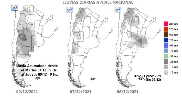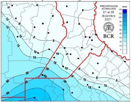El inicio de diciembre dejó agua para muy pocos Solo el 15% de la región núcleo recibió más de 20 mm en estos primeros 9 días de diciembre. Los milimetrajes se focalizaron solo en el sudoeste de la región. En el noroeste bonaerense, Gral. Villegas acumuló 76 mm y Gral. Pinto, 46 mm. En el extremo sudoeste de Santa Fe, Rufino también registró 46 mm. En el resto de la región los acumulados estuvieron por debajo de los 15 mm e, incluso, en el norte y este no se registraron lluvias.