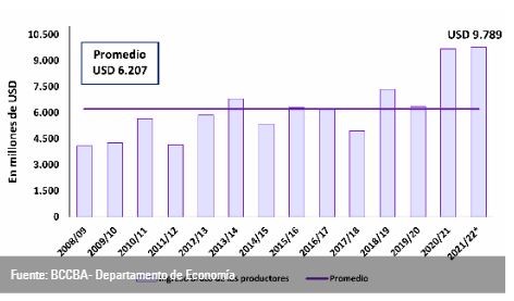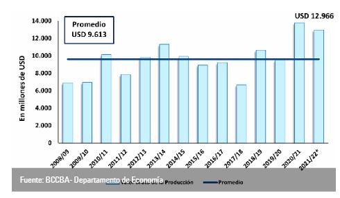 Respecto al ingreso bruto de la producción, que mide la retribución a los agentes que participan del proceso productivo descontando los derechos de exportación y los gastos portuarios, se espera un potencial de USD 9.789 millones, 103 millones de dólares por encima del valor alcanzado en el ciclo 2020/21 y el más alto de la historia.
