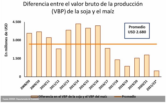 Se dio una mejora relativa en el precio interno del maíz respecto a la soja, lo que incentivó un incremento en el área sembrada con el cereal. Actualmente, se espera la menor diferencia de la historia, ubicándose en USD 480 millones, 82% menor al promedio.