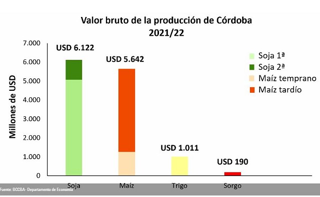 El mayor aporte en el valor bruto de la producción de Córdoba provendría de la soja, con USD 6.122 millones, 18% menor al de la campaña previa pero 12% por encima del promedio de las ultimas 10 campañas. En orden de importancia le sigue el maíz, con un aporte estimado de USD 5.642 millones, reflejando una caída del 1% respecto a la campaña anterior, pero ubicándose 102% por encima del promedio de los últimos 10 años. Por su parte, el valor bruto de la producción de trigo sería 122% mayor al del año previo y 55% mayor al promedio de las últimas 10 campañas debido tanto a la recuperación de la producción como al elevado precio de exportación (USD 299/tn). Respecto al sorgo, se observa que el ingreso potencial de divisas alcanzaría los USD 190 millones, USD 15 millones más que la campaña pasada.