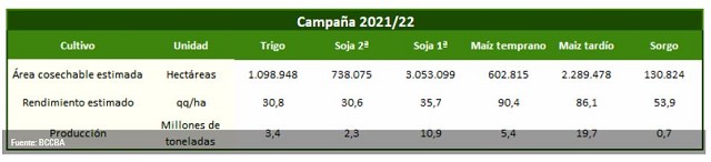 Para la campaña 2021/22, la superficie cosechable de trigo se espera cercana a 1,1 millón de hectáreas, mientras que el área sembrada de los cultivos estivales se estima en 7,3 millones de hectáreas. Bajo estos parámetros, y considerando el promedio de las últimas tres campañas para los cultivos, la producción cordobesa podría alcanzar 42,4 millones de toneladas, un 3% por encima del ciclo previo y podría constituirse como el mayor valor en la historia. Para el trigo se utiliza una estimación del rendimiento en base a la información provista por los colaboradores de la BCCBA.