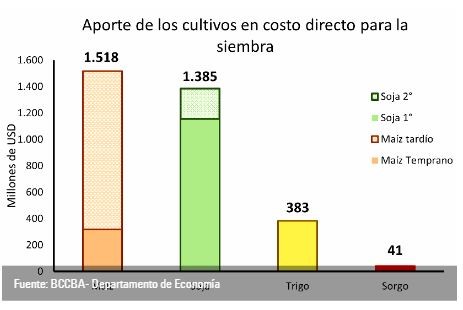Considerando los cultivos analizados, cubrir los costos directos implicaría una inversión de USD 3.297 millones, 33% más que en la campaña previa, debido al incremento en los precios de los fertilizantes y agroquímicos. De este total, USD 1.518 millones pertenecerían al maíz, USD 1.385 millones a la soja, USD 353 millones al trigo y USD 41 millones al sorgo.