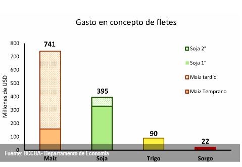 En relación al flete, se requerirían 1.414.000 viajes para trasladar la producción cordobesa, de los cuales 1.167.000 serían hacia el puerto de Rosario y 247.000 serían intra provincial. Con esto en consideración, el transporte implicaría un desembolso de USD 1.248 millones en concepto de fletes, 84% más que la campaña previa tanto por la mayor producción como por el incremento en el costo del transporte. De este total, un 59% sería consecuencia directa del maíz ya que, si bien el área sembrada es menor a la de la soja, su elevado volumen de producción por cada hectárea es más elevado que el de la oleaginosa, requiriendo un mayor servicio de transporte. El 32% del gasto en flete se atribuiría a la soja.