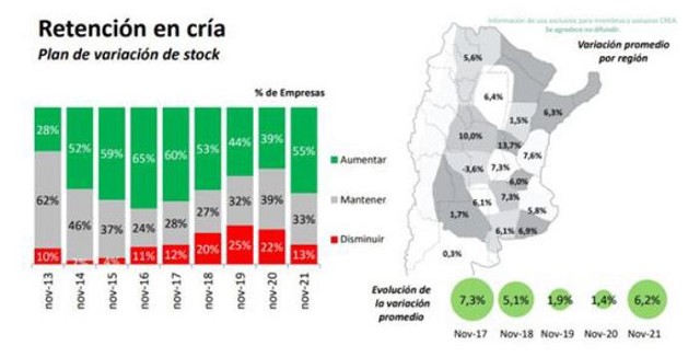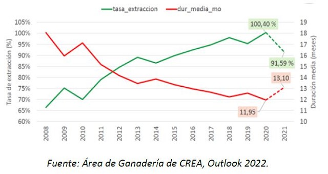 “La tasa de extracción de machos bajó casi 10 puntos en 2021, en línea con un crecimiento de la duración media de la invernada; es decir, se alargó el ciclo de engorde”, explicó Lizzi durante el último Outlook Ganadero CREA. Un fenómeno similar se observó en los rodeos de vaquillonas.