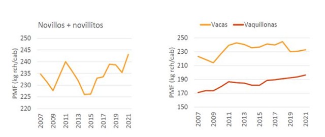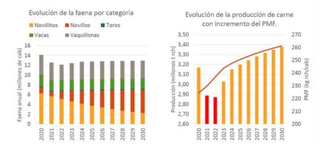 Mientras que en 2006 el período de terminación promedio a nivel nacional era de 18 meses y el peso medio de faena era de 238 kilogramos res con hueso, en 2020 estas cifras fueron de 12 meses y 250 kilogramos gracias a un proceso de intensificación que permitió proveer un mayor volumen de carne vacuna.
